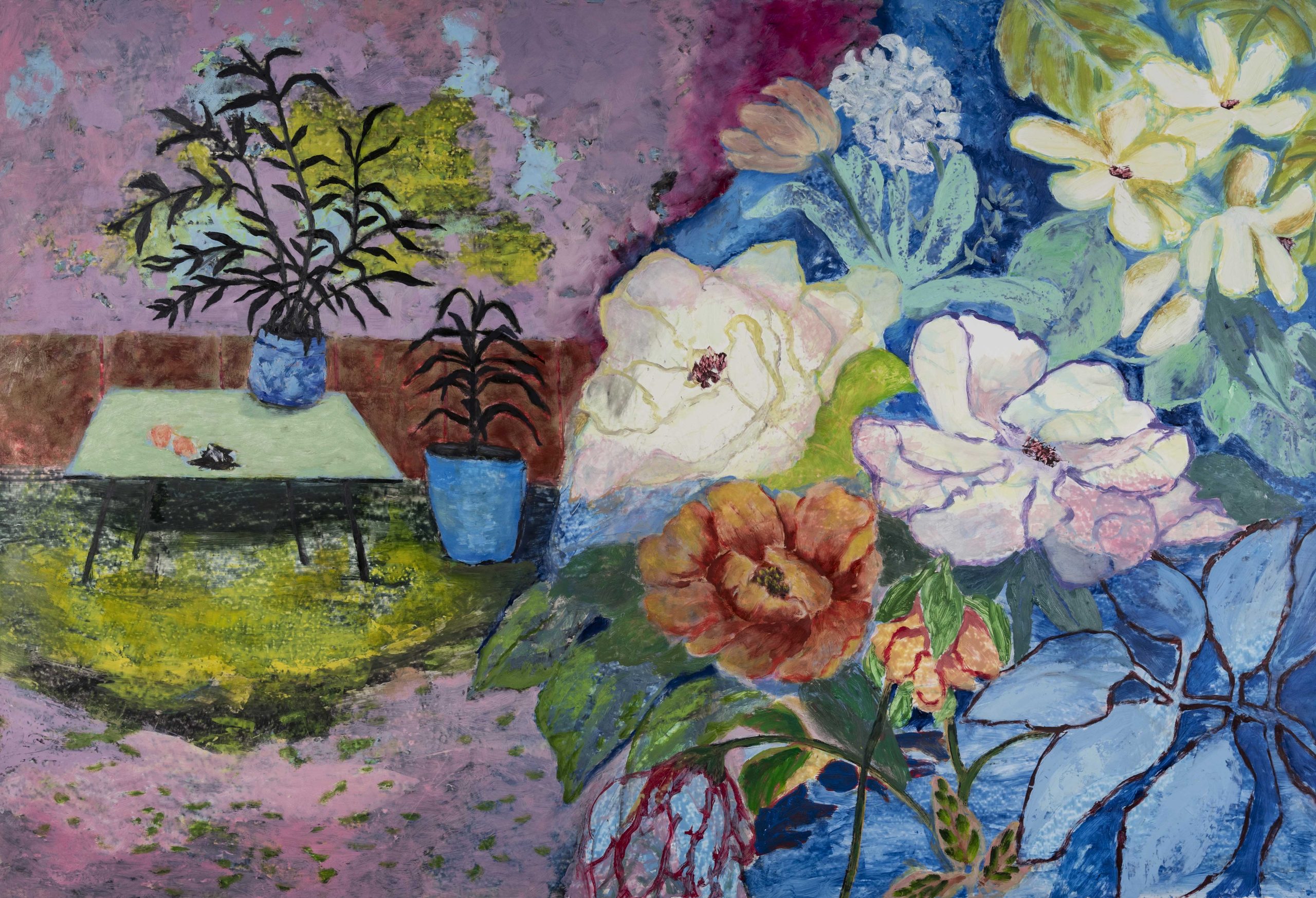 Raised in rural Wisconsin and moving seven times in thirteen years piqued my interest in diverse landscapes, flora and fauna. Whether a mass of color blur or the focal point, each is recording its environment and time. My chemical engineering background is reflected in my creative practice focusing on materials and process. The bold use of initial marks that swirl through the backgrounds of floral compositions, echo and amplify the rhythms of the naturally drawn floral elements.