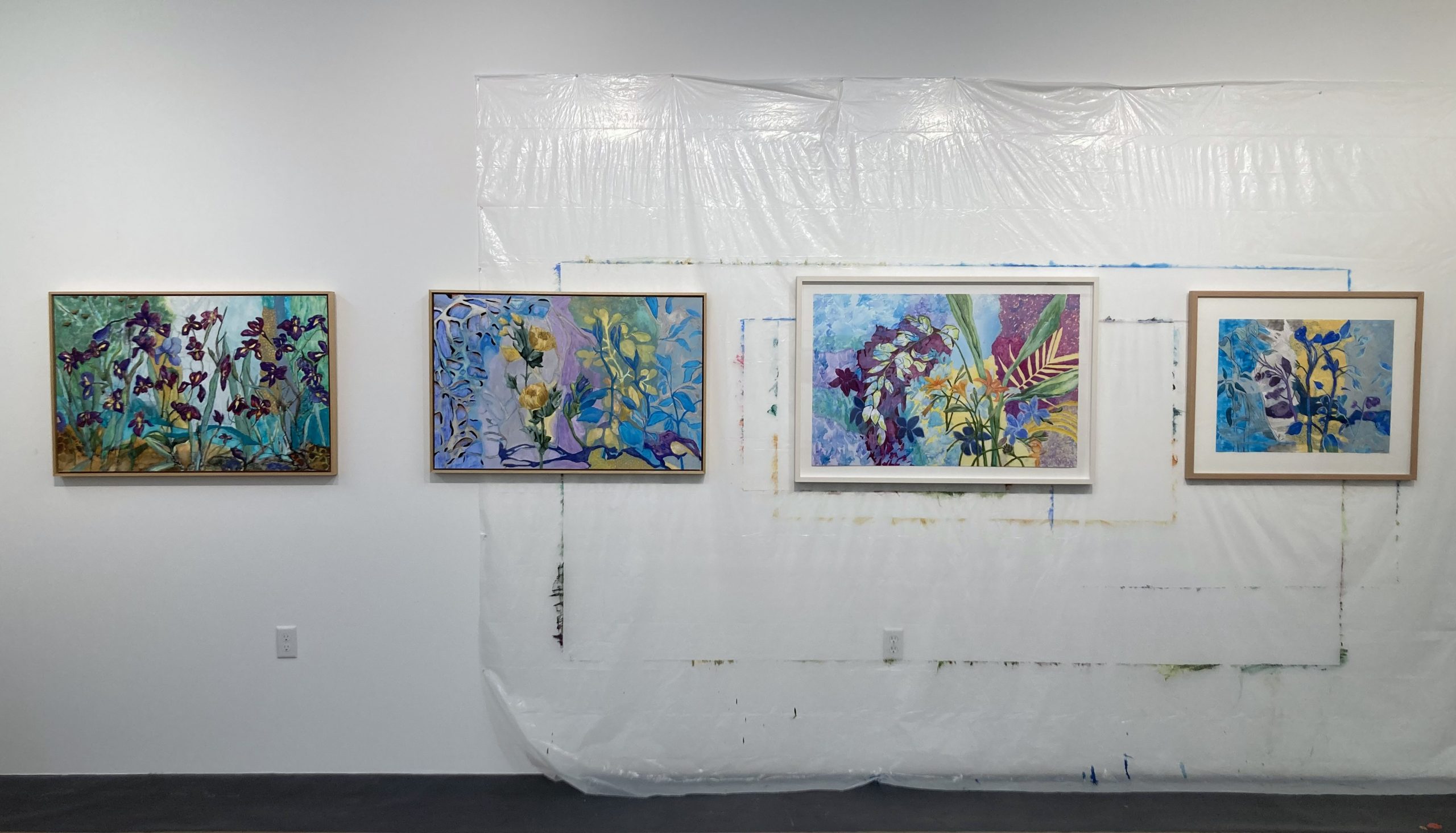 Irises, Ink, Watercolor and Oil on Yupo, 26″ x 40″, Framed